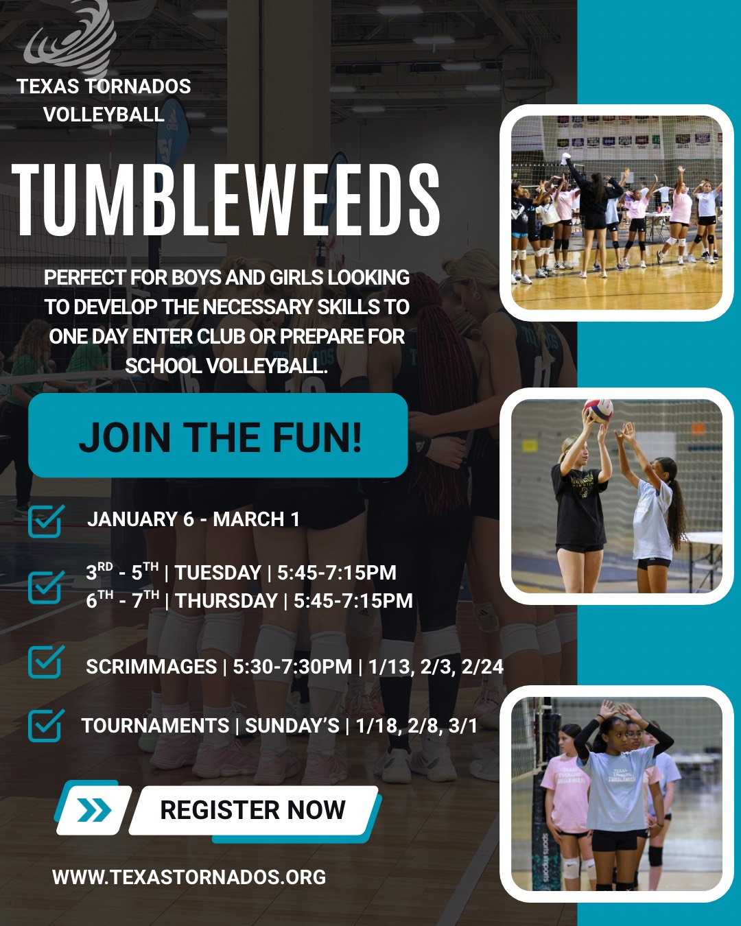 Our Tumbleweeds Developmental Program is designed for boys and girls in 3rd – 8th who want to build strong volleyball fundamentals in a fun and supportive setting. Players will develop the skills and confidence needed to one day join a club team or prepare for school volleyball.