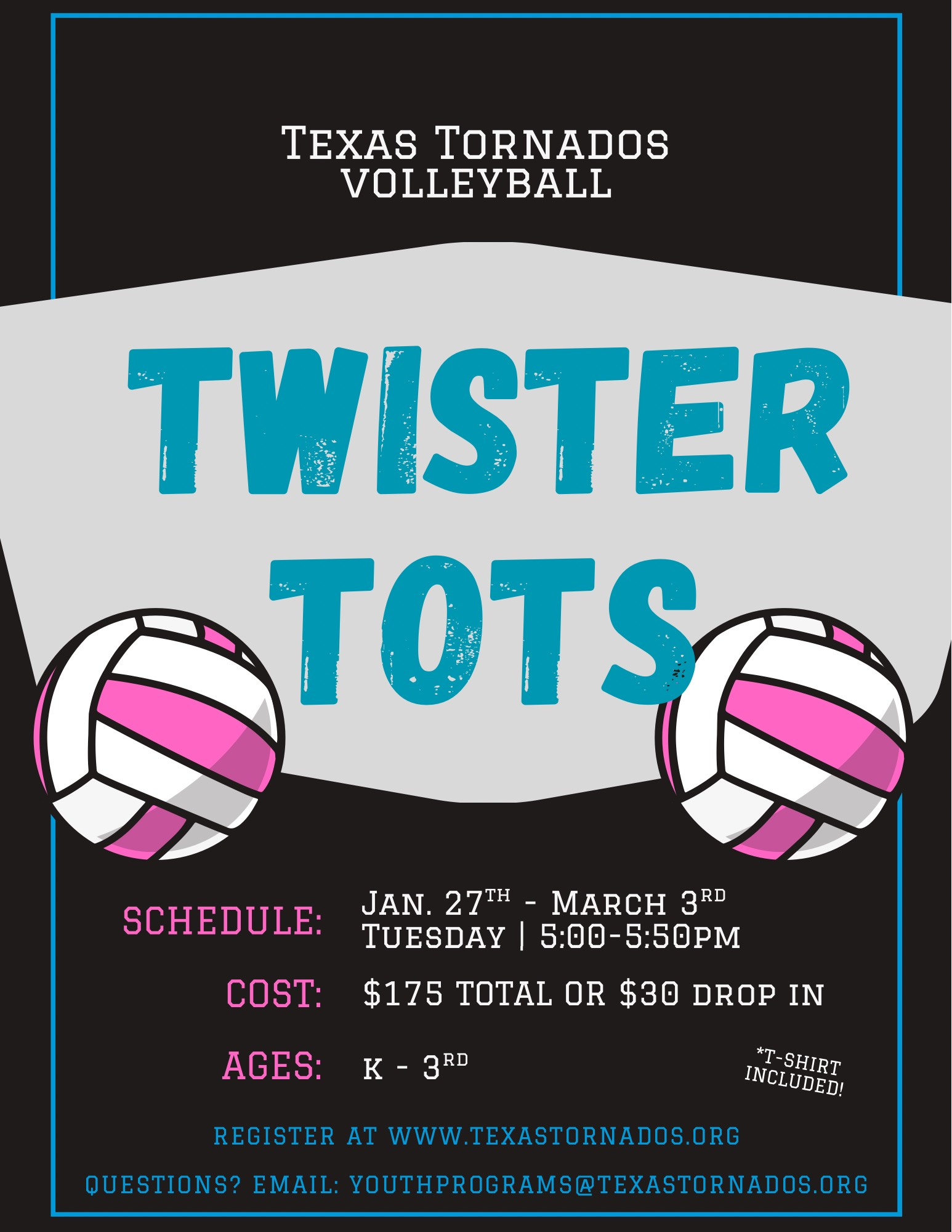 Our Twister Tots Program is the perfect entry-level volleyball experience for boys and girls in Kinder–3rd Grade!